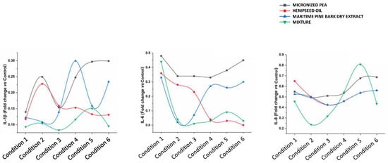 The data obtained show that micronized PEA has a dose-independent anti-inflammatory effect on IL-6 expression, while maritime pine bark dry extract and hempseed oil have an inversely dose-dependent effect. The former contributes to anti-inflammatory action at the highest concentrations tested (Conditions 2 and 3, which correspond to the concentrations of 10 and 5 μg/mL); the latter has a greater effect, when used at the lowest concentrations (Conditions 4, 5, and 6, which correspond to 12.5, 6.25, and 3.125 μg/mL). The synergistic reduction of the IL-6 of maritime pine bark dry extract and hempseed oil within the mixture is greater in Condition 3 (fold change 0.01), which corresponds to a concentration equal to 230 μg/mL. Similar effects were also observed for IL-1β. The three functional ingredients taken individually reduce IL-8 in a dose-independent manner, while, when combined, they create a synergistic effect with an increased anti-inflammatory activity for IL-8 under Conditions 1, 2, and 3, corresponding to the mixture concentrations of 690, 460, and 230 μg/mL.