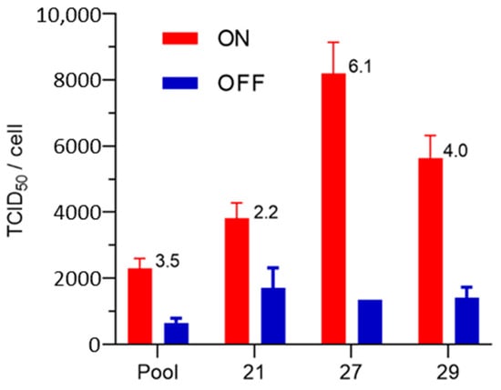 Production of AdPS- by the SF-BMAdR-CymR-PS pool and the 3 best clones (21, 27, and 29). Two wells of six-well plates for each subclone were infected with AdPS- using a MOI of 5 TCID50/cells in the presence or absence of the cumate (n = 2). The specific productivity was measured by TCID50 in duplicate and the ON/OFF ratio values are indicated above the bars. The data represent the mean ± SEM.
