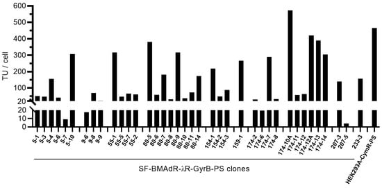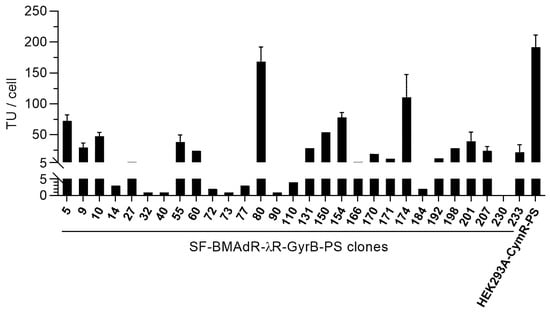 Production of AdPS-/CU by SF-BMAdR-λR-GyrB-PS subclones. Cells were infected using a MOI of 5 transduction unit(s) (TU)/cell in the presence of 5 nM of coumermycin. The specific productivities of infectious vector particles (TU/cell) were determined by flow cytometry (n = 1). The HEK293A-CymR-PS cell line was infected in the same manner in the presence of 50 μg/mL of cumate and used as a comparison.