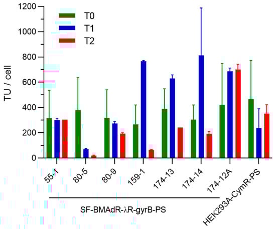 Stability of SF-BMAdR-λR-GyrB-PS subclones and the HEK293A-CymR-PS pool over a period of two months. A total of 500,000 cells were infected in 24 wells in duplicate (n = 2) with AdPS-/CU at a MOI of 5 TU/cell in the presence of coumermycin (5 nM) for SF-BMAdR-λGyrB-PS subclones and cumate for the HEK293A-CymR-PS pool. The specific productivities of infectious vector particles (TU/cell) were determined by flow cytometry; the mean ± SEM is shown.