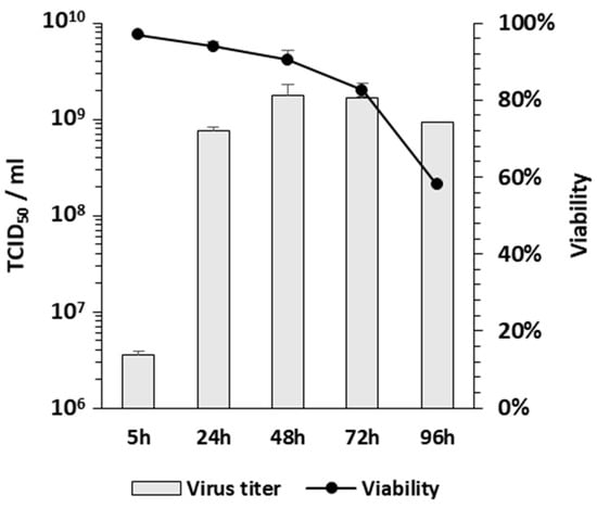 Determining the best harvesting time is critical for the large-scale production of AdV. On the first day of infection, we demonstrated that different backbones of PS-deleted AdV showed delays in the expression of the transgene compared to RC-AdV. However, transgene expression reached the same level in both groups at 48 hpi and declined at 72 hpi []. To determine the best harvesting time to allow maximum production, we evaluated the AdPS- growth curve in the SF-BMAdR-λR-GyrB-PS-174-12A subclone from 5 h to 96 hpi. The best harvesting time was between 48 and 72 hpi, with cell viability between 91 and 83% (Figure 5), which is similar to the RD-AdV production in our laboratory.