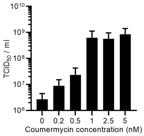 The infected SF-BMAdR-λR-GyrB-PS-174-12A cells with AdPS- (n = 2) were induced with different concentrations of coumermycin at 5 hpi. The virus progeny was measured by the TCID50 assay in duplicate, expressed as TCID50/mL, and shown as mean ± SEM.