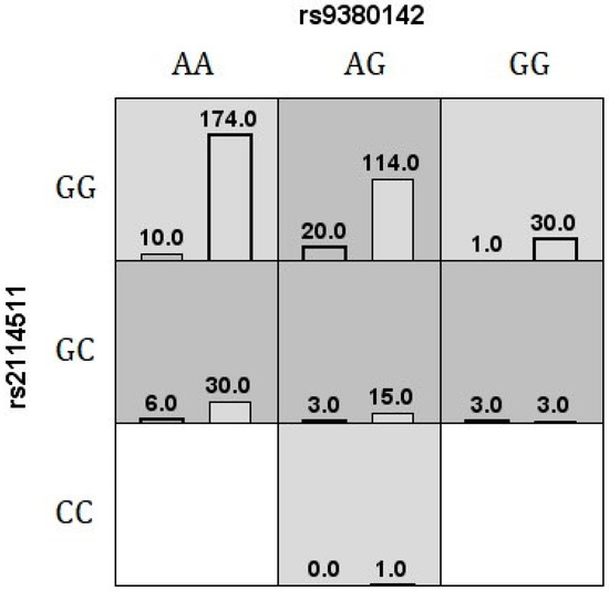 The MDR method performs a data reduction strategy that classifies genotypes as high- or low-risk groups, reducing the predictors from n to one dimension [36]. All possible genotype combinations are tested, and the software reports the best model for disease risk classification or the model showing maximum TBA and CVC values [76]. The most significant model associated with vitiligo using MDR v.3.0.2 was a second-order combination between HLA-G rs9380142 and LILRB1 rs2114511, accurately classifying 65% of tested individuals in 9 out of 10 validation intervals (Figure 1). According to GMDR v.0.9 [40], the same second-order combination (rs9380142/rs2114511) previously identified by MDR v.3.0.2 was selected as the best model for this disease (signal p-test = 0.0107), allowing for accurately classifying 64% of the individuals in all 10 validation intervals. Another extension to the MDR method is MB-MDR [41], which allows one to consider the ancestry composition in the association test. Instead of selecting the best model, it provides a set of combinations whose significance has been assessed by a permutation test. The same SNP combination was again identified as the best model for the disease (permutation p-value = 0.0130).