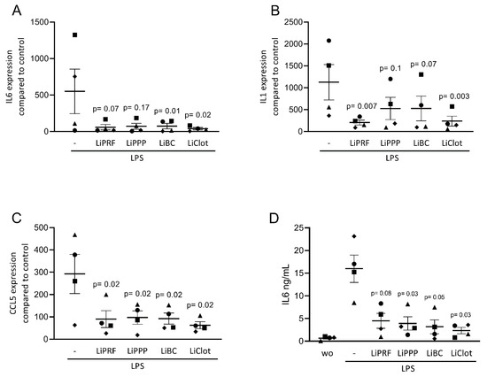 - Kargarpour, Z.; Nasirzade, J.; Panahipour, L.; Miron, R.J.; Gruber, R. Liquid PRF Reduces the Inflammatory Response and Osteoclastogenesis in Murine Macrophages. Front. Immunol. 2021, 12, 636427. [Google Scholar] [CrossRef]