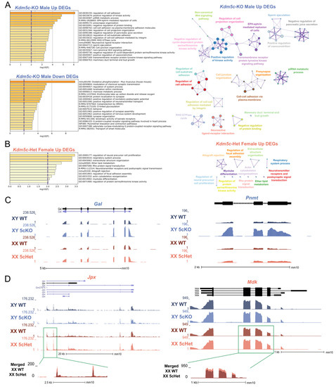 In females, key development-related genes contributed to the female-specific ontology enrichment. One gene of interest is midkine (Mdk), with a slight but significant upregulation in Kdm5c-HET females but not in Kdm5c-KO males (Figure 2D, Table 1). Mdk is a neurotrophic factor expressed transiently during embryogenesis to promote neurite outgrowth [51,52]. Another female-specific DEG, JPX transcript, XIST activator (Jpx) is a long-noncoding RNA (lncRNA) crucial for X-inactivation, a females-specific epigenetic process [53,54] (Figure 2D, Table 1). Jpx is upregulated as both male and female embryonic stem cells differentiate, but the gene promotes X-inactivation only in females by inducing Xist expression [53,54]. All differentially expressed up- and downregulated genes found in males and females are listed in Supplementary Table S1.