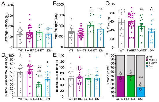 In the 3-chambered social interaction task (Figure 3D,E), both WT and Kmt2a-HET females showed a significant preference for interaction with the stranger mouse over the toy mouse (one-sample t-test WT: p = 0.046, Kmt2a: p = 0.012), DMs showed no preference (p = 0.068), and Kdm5c-HETs showed a significant avoidance of the mouse and preference for the toy (p < 0.001). This pattern was also evident in comparing between genotypes, where a significant overall effect of genotype (F(3,78) = 8.053, p < 0.001, ηp2 = 0.244) was driven by a significant decrease in social preference by Kdm5c-HET females compared with both WT (p = 0.001) and Kmt2a (p < 0.001). DMs, despite showing no social preference and a trend towards avoidance, were not different from any other genotype, albeit with a trend towards decreased preference compared to Kmt2a mice (DM vs. WT: p = 0.125; vs. Kmt2a: p = 0.057; vs. Kdm5c p = 0.497) Figure 3D). Importantly, this is not driven by total interaction time. Across genotypes, animals interacted with stranger or toy a similar amount of time (time stranger + time toy; F(3,78) < 1) (Figure 3E). This pattern suggests that both Kdm5c-HET and DM females are impaired in social preference but that Kmt2a knockdown in Kdm5c-HETs nevertheless may decrease avoidance of the stranger mouse.