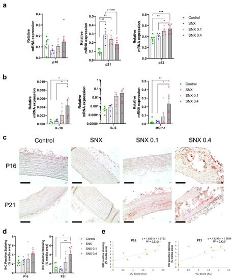 We assessed the expression of senescence markers p16Ink4a, p21Cip1 and γH2AX in rat TAs. p16Ink4a expression at mRNA and protein level (Figure 2a,c,d) positively correlated with VC (p < 0.05 for mRNA and p < 0.01 for protein expression, Table 3 and Figure 2e, respectively). p16Ink4a protein expression was observed in vascular cells’ nuclei in the calcified area (Figure 2c and Figure 3d). Protein expression of p21Cip1 was increased in SNX 0.4 versus controls (p < 0.05) and positively correlated with VC score (p < 0.05, Figure 2c–e). At the mRNA level, p21Cip1 was negatively correlated with VC (Table 3, p < 0.05), suggesting important post-transcriptional regulation of p21Cip1 expression []. p21Cip1 protein was expressed close to calcium deposits (Supplementary Figure S5, Figure 2c). In addition, mRNA expression of p53 was increased in SNX 0.1 (p < 0.05) and SNX 0.4 (p < 0.001) groups (Figure 2a). We also investigated the production of distinct cytokines and chemokines contributing to the SASP, and found that Interleukin 1 beta (Il-1β) (p < 0.05) and Monocyte Chemoattractant Protein-1 (Mcp-1, p < 0.01) mRNA expression was increased in the SNX 0.4 group, and Mcp-1 expression correlated with VC score (p < 0.05, Figure 2b, Table 3).