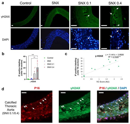 Senescent cells display DNA damage response components such as γH2AX. Using IF, we found an increase in γH2AX-positive cells close to calcium deposits in SNX 0.4 group versus control and SNX (p < 0.01 for both, Figure 3a,b), which strongly correlated with the level of VC (p < 0.001, Figure 3c). We observed that γH2AX-positive cells also expressed p16Ink4a (Figure 3d), thus displaying different markers of senescent cells. In addition, some γH2AX-positive cells also expressed α-SMA, indicating contractile VSMC origin of senescent cells in calcified TAs (Supplementary Figure S6).