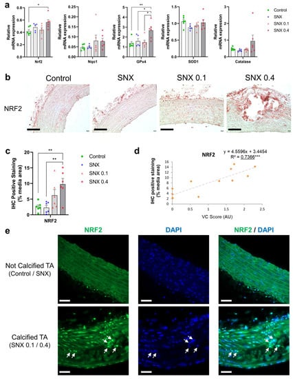 NRF2 expression was increased in the SNX 0.4 group versus controls at both the mRNA (Figure 4a, p < 0.05) and protein (Figure 4b,c, p < 0.01) levels, and positively correlated with VC (p < 0.05 for mRNA and p < 0.001 for protein, Table 3, Figure 4d). mRNA expression of NAD(p)H quinone dehydrogenase 1 (Nqo1), a downstream target of NRF2, increased with VC score (p < 0.01, Table 3). mRNA expression of Glutathione peroxidase 4 (GPx4), also regulated by NRF2, was increased in the SNX 0.4 group (Figure 4a, p < 0.01). IF revealed that NRF2 was expressed in vascular cells close to calcium deposits and localized in the nucleus (Figure 4e), suggesting NRF2 translocation from the cytoplasm.