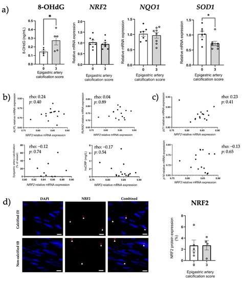 8-Hydroxydeoxyguanosine (8-OHdG), a marker of oxidative stress, was significantly increased in the severely calcified patients (p < 0.05; Figure 6a). However, NRF2 (mRNA and protein) and NQO1 (mRNA) were unchanged between the calcified and non-calcified groups (both p > 0.05, Figure 6a,d), while SOD1 mRNA expression was significantly decreased in the calcified group. NRF2 gene expression did not correlate with other parameters evaluated, including hsCRP, osteogenic genes, % calcification, p16Ink4a or p21Cip1 expression (Figure 6b,c).