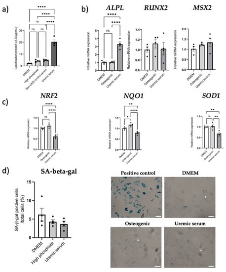VSMC calcification was increased when osteogenic media were supplemented with uremic serum, compared to DMEM, high-phosphate and non-CKD control serum groups (all p < 0.0001; Figure 7a). Gene expression analysis was then performed for the uremic serum condition since a pro-calcifying effect was observed. We found ALPL gene expression increased in the presence of uremic serum (p < 0.0001 vs. controls; Figure 7b), while RUNX2 expression remained unchanged. Msh Homeobox 2 (MSX2) gene expression was elevated by uremic serum, however, it did not reach statistical significance (Figure 7b). Uremic serum-induced calcification was associated with lower NRF2, SOD1 and NQO1 gene expression (all p < 0.01 vs. osteogenic control; Figure 7c), however, it was not associated with changes in senescence markers p16Ink4a and p21Cip1 (both p > 0.05; Supplementary Figure S8) or SA-β-Gal staining (p > 0.05; Figure 7d).