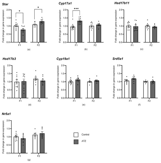 F1 and F2 testis gene expression assessed by qRT-PCR. (a) Star, Steroidogenic acute regulatory protein, (b) Cyp17a1, Cytochrome P450 family 17, subfamily A member 1, (c) Hsd17β11, Hydroxysteroid 17-beta dehydrogenase 11, (d) Hsd17β3, Hydroxysteroid 17-beta dehydrogenase 3, (e) Cyp19a1, Cytochrome P450 family 19, subfamily A member 1, (f) Srd5α1, Steroid 5 alpha-reductase 1 and (g) Nr5a1, Nuclear receptor subfamily 5 group A member 1 (SF-1). Genes were normalized to the geometric mean of B-actin, TBP, and Rlp19. Results were represented as a fold change in gene expression relative to the control, using the Pfaffl method [46]. Data are means ± SEM. Significance between the control (n = 8–10) and ATZ (n = 8–10) is indicated by an asterisk (* p < 0.05 or *** p < 0.001). There were >4 L per treatment, per generation.