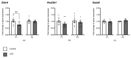 F1 and F2 testis gene expression assessed by qRT-PCR. (a) Ddx4, DEAD-box helicase 4–germ, cells, (b) Hsd3b1, Hydroxy-delta-5-steroid dehydrogenase, 3 beta-and steroid delta-isomerase 1–Leydig cells, and (c) Gata6, GATA binding protein 6–Sertoli cells. Genes were normalized to the geometric mean of B-actin, TBP, and Rlp19. Results were represented as a fold change in gene expression relative to the control, using the Pfaffl method [46]. Data are mean ± SEM. Significance between the control (n = 8–10) and ATZ (n = 8–10) is indicated by an asterisk (** p < 0.01). There were >4 litters per treatment, per generation.