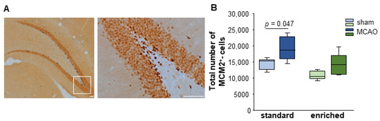Proliferation of MCM2+ cells after stroke and EE housing. (A) Peroxidase-stained images of MCM2+ cells in the dentate gyrus. Dark brownish cells were identified as MCM2+ cells. (B) Significant changes in the endogenous proliferation in the dentate gyrus were detected under standard housing conditions. Statistical analysis was performed using the Mann–Whitney U test, scale bar = 100 µm, higher magnification 10 µm.