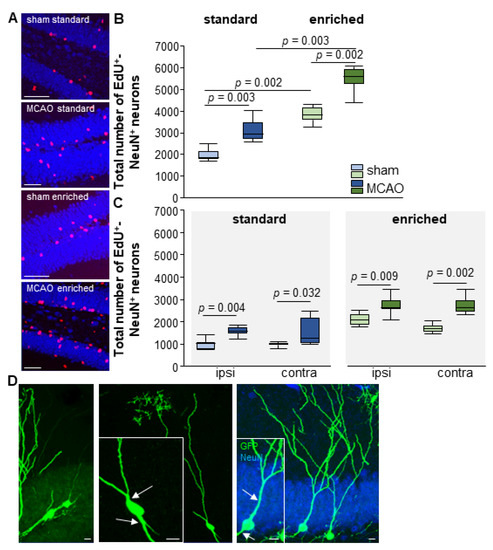 Stroke and EE-induced neurogenesis. (A,B) MCAO induction significantly increased new neuron formation 7 weeks later. EE significantly increases the number of newly generated neurons in both sham and MCAO mice. (C) This increase occured ipsi- and contralaterally in all groups. The boxplots show the median, upper and lower quartile, and minimum and maximum values. Statistical analysis was performed using the Mann-Whitney U test, scale bar = 50 µm. (D) Aberrant GFP-labelled new neurons with two dendritic trees (white arrows), one dendritic tree extending into the hilus (GFP green, NeuN blue). Scale bar = 10 µm. For the morphological analyses of the newly born neurons, we determined the following numbers of cells: MCAO-SD n = 20; MCAO-sham n = 28; MCAO-EE n = 24; sham-EE n = 9. Scale bar = 10 µm.