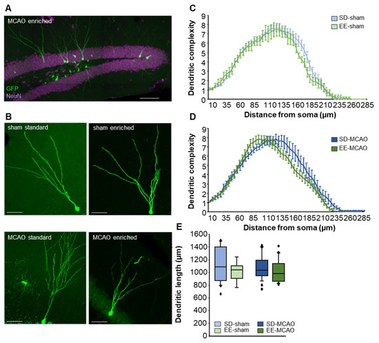 Approximately 6 weeks after injection of the GFP viral vector, the majority of the newly formed neurons showed a typical morphology of granule cells (Figure 6A,B). The dendrites extended apical processes into the molecular layer (Figure 6A,B). Morphological analysis of complexity (Figure 6C,D) and dendrite length (Figure 6E) of GFP-positive neurons did not show any significant changes due to either MCAO or EE housing.