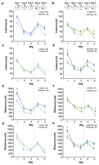 Here, the MCAO-EE animals showed better learning performance compared with the MCAO mice in the standard cage (MCAO-EE vs. MCAO-SD latency: D1: p = 0.001; F(1) = 21.006; D2: p = 0.542; F(1) = 0.396; D3: p = 0.543; F(1) = 3.94; D4: p = 0.111; F(1) = 3.005; D5: p = 0.132; F(1) = 2.646; distance: D1: p = 0.006; F(1) = 11.662; D2: p = 0.528; F(1) = 0.425; D3: p = 0.630; F(1) = 0.245; D4: p = 0.517; F(1) = 0.448; D5: p = 0.276; F(1) = 1.312; velocity: D1: p = 0.143; F(1) = 2.491; D2: p = 0.561; F(1) = 0.359; D3: p = 0.726; F(1) = 0.129; D4: p = 0.178; F(1) = 2.067; D5: p = 0.103; F(1) = 3.167) (Figure 7D,H).