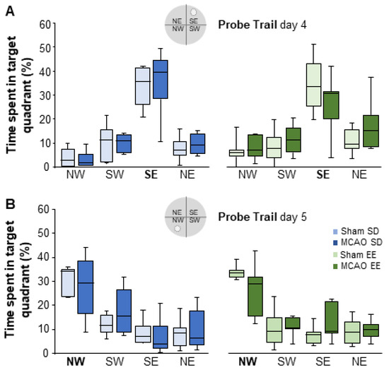 The probe trial took place on day 4 before the platform position was changed and on day 5 after the platform was placed on the opposite side. The probe trial served to verify the learned platform position (Figure 8). On day 4 (SE quadrant: sham-SD Mdn = 34%; MCAO-SD Mdn = 39%; U = 16.50; n = 13; p = 0.534; sham-EE Mdn = 33%; MCAO-EE Mdn = 30%; U = 13.50; n = 14; p = 0.165; sham-EE Mdn = 34%; sham-SD Mdn = 33%; U = 24.00; n = 14; p = 1.000; MCAO-EE Mdn = 39%; MCAO-SD Mdn = 30%; U = 9.50; n = 13; p = 0.101; Figure 8A) as well as on day 5 (NW quadrant: sham-SD Mdn = 35%; MCAO-SD Mdn = 29%; U = 18.00; n = 13; p = 0.731; sham-EE Mdn = 34%; MCAO-EE Mdn = 30%; U = 10.00; n = 14; p = 0.073; sham-EE vs. sham-SD; U = 24.00; n = 14; p = 1.000; MCAO-EE vs. MCAO-SD; U = 19.00; n = 13; p = 0.836; Figure 8B), animals showed an increased preference for the previously learned platform position. No differences due to MCAO or EE housing were found.