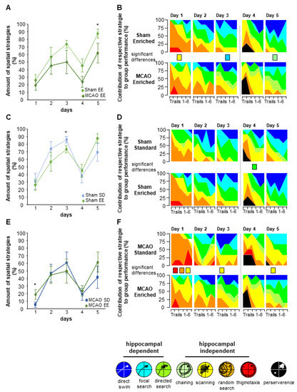 Analysis of hippocampus-dependent and independent search strategies in the MWM test. (A,C,E) Representation of hippocampus-dependent strategies over time. The data show an improved learning behavior in the EE sham group compared with the EE MCAO. Furthermore, there was more frequent use of the hippocampus-dependent strategies on day 1 in the MCAO-EE group compared with the MCAO-SD group. (B) Within the hippocampus-independent strategies, the MCAO-SD animals showed increased use of the scanning strategy on day 5. For analysis of the different hippocampal-dependent and -independent search strategies on each day, an exploratory data analysis by means of an algorithm based on the generalized estimating equations method was performed. Significant differences in strategies usage are represented by colorful squares for each day, * p < 0.05.