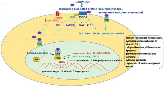 Vitamin D3 binding sites and signaling pathways. 1,25(OH)2D3—active form of vitamin D3; CAMK2g—g subunit of calcium/calmodulin-dependent protein kinase 2; CAV-1—caveolin-1; L-VGCC—L-type voltage-gated calcium channel; MAPK—Mitogen-Activated Protein Kinase; PDIA3—protein disulfide isomerase family A member 3; PI3-K—Phosphatidylinositol 3-Kinase; PKA—Protein Kinase A; PKC—Protein Kinase C; PLA2—Phospholipase A2; PLC—Phospholipase C; RXR—retinoid X receptors; SSH—sonic hedgehog; Wnt5a—ligand activating β-catenin-independent pathways; VDR—vitamin D receptor; VDRE—vitamin D response element.