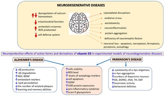 The pathogenic mechanisms of neurodegenerative diseases and neuroprotective effects of different forms of vitamin D3 in experimental models of Alzheimer’s and Parkinson’s diseases. Ab—amyloid b; BDNF—brain-derived neurotrophic factor; DA—dopamine; DAT—dopamine transporter; DOPAC—3,4-dihydroxyphenylacetic acid; GDNF—glial-derived neurotrophic factor; HVA—homovanillic acid; NGF—nerve growth factor; ROS—reactive oxygen species; Syn—synuclein; TH—tyrosine kinase; VDR— the vitamin D receptor.