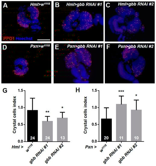 3.4. Knockdown of Gbb in Intermediate Progenitors and Progenitors Resulted in the Over-Differentiation of Crystal Cells and Plasmatocytes
