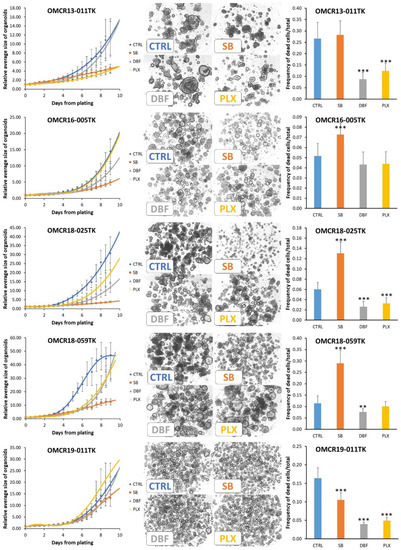OMCR18-035TK and OMCR19-010TK were sensitive to Dabrafenib. This inhibitory effect is difficult to explain. However, Phadke et al. previously observed similar activity in BRAF wild-type melanoma cell cultures [26]. In that model, Dabrafenib, but not Vemurafenib, specifically targeted NEK9 and CDK16, causing G0-G1 arrest. Finally, PLX8394 caused a reduced alteration in organoid growth. The evaluation of drug cytotoxicity showed variable results, with SB202190 doubling cell death in OMCR18-060TK. The cytotoxic effects on OMCR19-010TK organoids are of scarce biologic relevance, despite them having a strong statistical significance, according to the low number of cells affected.