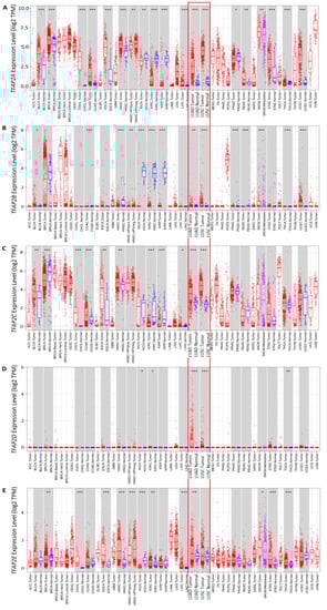 The mRNA expression of TFAP2 family genes in various cancer types and corresponding normal tissues from the Tumor Immune Estimation Resource (TIMER) database (https://cistrome.shinyapps.io/timer/, accessed on 10 November 2022) []. Data presented as red (tumor) and blue (normal tissue) box plots for (A) TFAP2A, (B) TFAP2B, (C) TFAP2C, (D) TFAP2D, and (E) TFAP2E. The dots represent the raw data. Significant differences are shown with asterisks: * p < 0.05, ** p < 0.01, *** p < 0.001. The red frame denotes lung adenocarcinoma (LUAD) and squamous cell carcinoma (LUSC) data.