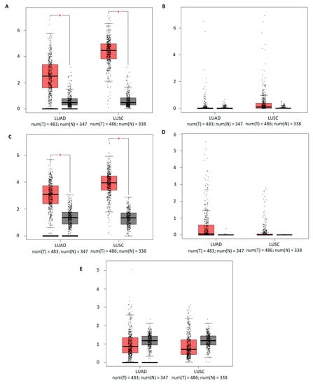 The mRNA expression of TFAP2 family members in lung adenocarcinoma (LUAD) and squamous cell carcinoma (LUSC) via the Gene Expression Profiling Interactive Analysis (GEPIA) database (http://gepia.cancer-pku.cn/index.html, accessed on 14 November 2022) []. Data presented as red (tumor) and gray (normal tissue) box-plots for (A) TFAP2A, (B) TFAP2B, (C) TFAP2C, (D) TFAP2D, and (E) TFAP2E. The black dots represent the raw data. Significant differences are shown with asterisks: * p < 0.05; T, tumor; N, normal.