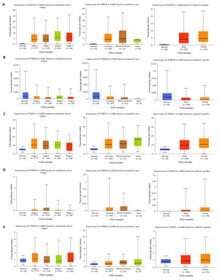 Differences in TFAP2 gene family members expression according to the clinicopathological factors of lung adenocarcinoma (LUAD) patients. UALCAN web tool with the default settings (http://ualcan.path.uab.edu/index.html, accessed on 16 November 2022) [,] was applied to generate individual expression boxplots of TFAP2A (A), TFAP2B (B), TFAP2C (C), TFAP2D (D), and TFAP2E (E) genes expression levels according to individual cancer stage, race and gender.