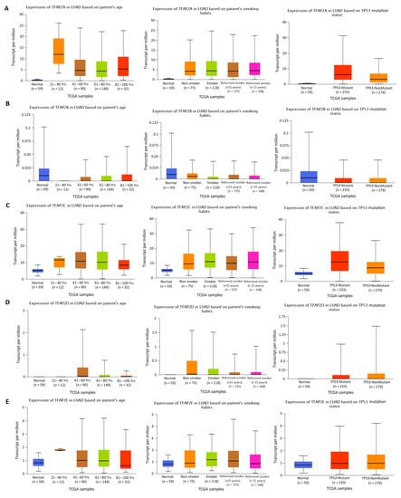 Differences in TFAP2 gene family members expression according to the clinicopathological factors of lung adenocarcinoma (LUAD) patients. UALCAN web tool with the default settings (http://ualcan.path.uab.edu/index.html, accessed on 16 November 2022) [,] was applied to generate individual expression box plots of TFAP2A (A), TFAP2B (B), TFAP2C (C), TFAP2D (D), and TFAP2E (E) gene expression levels according to individual age, smoking habits, and TP53 status.