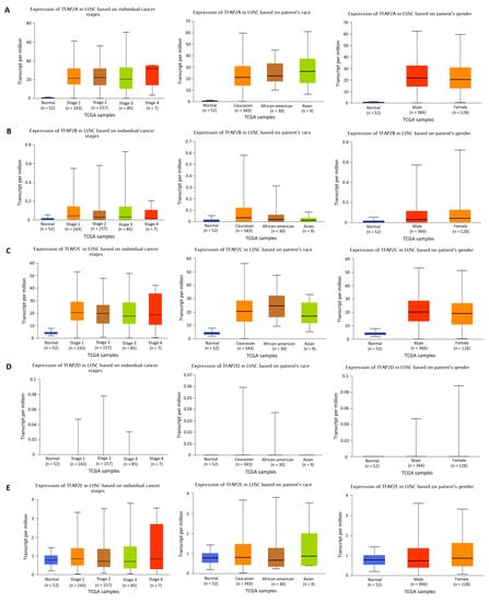 Differences in TFAP2 gene family members expression according to the clinicopathological factors of lung squamous cell carcinoma (LUSC) patients. UALCAN web tool with the default settings (http://ualcan.path.uab.edu/index.html, accessed on 16 November 2022) [,] was utilized to generate individual expression boxplots of TFAP2A (A), TFAP2B (B), TFAP2C (C), TFAP2D (D), and TFAP2E (E) gene expression levels according to individual cancer stage, race, and gender.