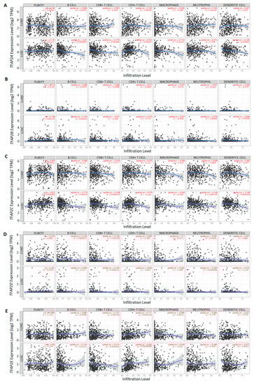 The TIMER database was also used to evaluate the specific correlations between TFAP2 gene family members with immune cells in LUAD and LUSC (https://cistrome.shinyapps.io/timer/, accessed on 10 November 2022) []. Infiltrating immune cells included by TIMER algorithm are CD4+T cells, CD8+T cells, B cells, neutrophils, macrophages, and dendritic cells. The data is displayed as scatterplots presenting the purity-corrected partial Spearman’s rho value and statistical significance.