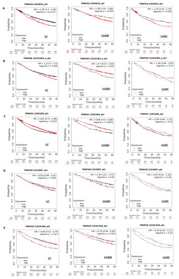 The correlation of TFAP2 family genes expression (low vs. high expression level) with patient overall survival (OS) in lung cancer (LC), adenocarcinoma (LUAD), and squamous cell carcinoma (LUSC) for (A) TFAP2A, (B) TFAP2B, (C) TFAP2C, (D) TFAP2D, and (E) TFAP2E, respectively. The survival curves were retrieved from the Kaplan–Meier plotter (https://kmplot.com/analysis/, accessed on 20 November 2022) [].