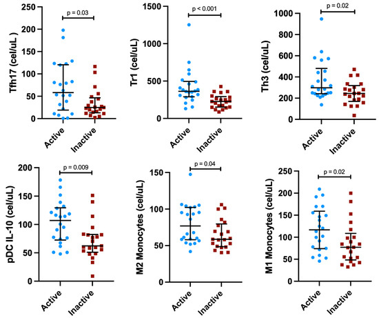 Patients with active IgG4-RD showed higher numbers of Tfh17 (p = 0.03), Tr1 (p < 0.001), Th3 (p = 0.02), pDC IL-10+ (p = 0.009), M2 (p = 0.04), and M1 monocytes (p = 0.02), compared with patients with inactive disease (Figure 1; Supplementary Table S5).
