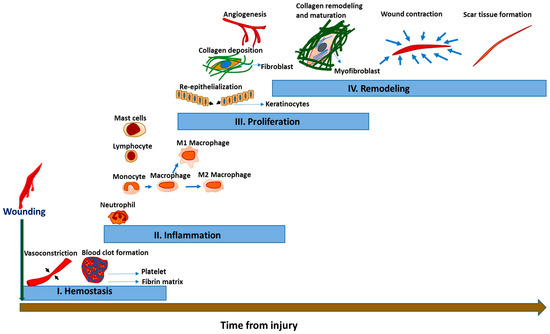 The phases of acute wound healing, including hemostasis (I), inflammation (II), proliferation (III), and remodeling (IV). Hemostasis begins soon after wounding with vasoconstriction and blood clot formation. This is followed by the infiltration of inflammatory cells. Then, re-epithelialization occurs with collagen deposition and angiogenesis during the proliferation phase. Finally, the remodeling phase occurs with collagen remodeling and maturation, wound contraction, and scar tissue formation.