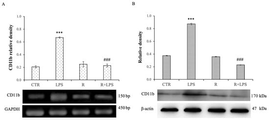 3.2. Resveratrol Modulates CD11b Expression Levels in LPS-Treated N13 Microglial Cells
