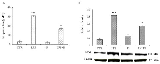 3.3. Effects of Resveratrol on Nitric Oxide Production and Inducible Nitric Oxide Synthase Protein Expression Levels in LPS-Treated N13 Microglial Cells