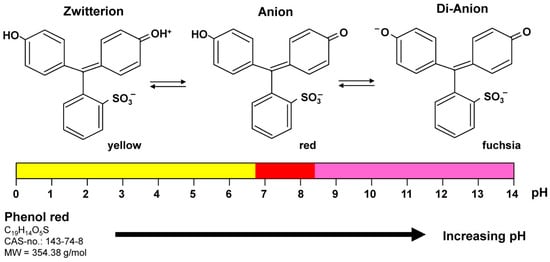 Phenol red also known as phenolsulfonphthalein is the most frequent pH indicator in cell cultures. This water-soluble dye is a yellow zwitterion at low pH, while it changes to a red-colored anion or a fuchsia-colored di-anion at more basic conditions (Figure 1). Therefore, this dye has been used as an inert pH indicator dye in many tissue culture media to detect pH shifts, waste products of dying cells, or overgrowth of contaminants that typically cause an acidification of the medium. However, based on its structural resemblance to some non-steroidal estrogens, it has the capacity to bind to estrogen receptors with an affinity of 0.001% of that of estradiol, thereby stimulating the proliferation of estrogen receptor positive cells []. Thus, it is advisable to dispense phenol red during experimentation when working with estrogen-responsive cell systems.