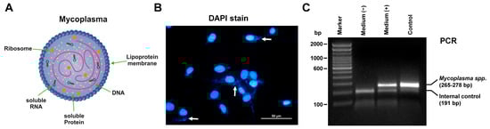 Detection of Mycoplasma spp. in cell culture supernatants. (A) Mycoplasmas are the smallest self-replicating bacteria devoid of a cell wall. They consist of a lipoprotein plasma membrane, ribosomes, and a genome consisting of a circular, double-stranded DNA molecule. (B) A monolayer of a mycoplasma-contaminated rat cell line was stained with DAPI and analyzed under a fluorescent microscope with an appropriate UV filter package (340/380 nm excitation) at a magnification of 400×. Please note the very small bright extranuclear dots that are typical for mycoplasmas (marked by arrows). The scale bar represents 50 µm. (C) In the depicted analysis, 2 µL normal control medium (Medium (−) and 2 µL medium taken from a Mycoplasma-infected cell line (Medium (+)) were tested for Mycoplasma infection using the Venor®GeM OneStep kit (#11-8050, Minerva biolabs GmbH, Berlin, Germany) according to the manufacturer’s instructions. As a positive control, 2 µL of the positive control included in the kit system was co-amplified. The internal control in each sample resulting in an amplicon of 191 bp in size demonstrates the functionality of the PCR reaction, while an amplicon of 265–278 bp in size indicates a contamination with Mycoplasma spp. The PCR products were separated on a 2% standard agarose gel containing ethidium bromide and amplicons visualized using a standard gel imager.