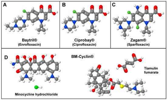 Selected compounds useful to remove or prevent Mycoplasma contaminations. (A) Baytril (CAS-no.: 93106-60-6), (B) Ciprobay (CAS-no.: 85721-33-1), (C) Zagam (CAS-no.: 110871-86-8), and (D) BM-Cyclin containing Minocycline hydrochloride (CAS-no.: 13614-98-7) and Tiamulin fumarate (CAS-no.: 55297-96-6) are powerful anti-mycoplasma agents that are used to eliminate or prevent mycoplasma contamination. For the biological activity of the depicted compounds, refer to Table 3.