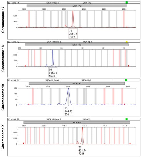 In STR analysis, the amplified variable microsatellite regions obtained from the template DNA are separated on a genetic analyzer and subsequently analyzed with software that calculates the number of repeats at each variant site. Nowadays, effective and standardized STR panels are established for many species. In this regard, the Consortium for Mouse Cell Line Authentication that has established a multiplex PCR assay comprising 19 mouse STR markers is pioneering [,]. This multiplex PCR provides a unique STR profile for different mouse cell lines, including closely related cell lines. Representative chromatograms of four STR markers obtained for the widely used immortalized murine cell line AML12 are depicted in Figure 6.
