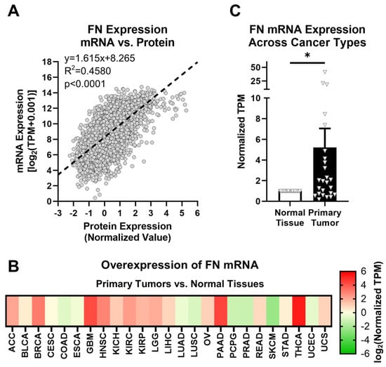 FN expression in primary tumors. (A) Correlation between FN protein and mRNA expression (n = 6539). (B) Overexpression of FN mRNA in primary tumors versus normal tissues (n = 25). Cancer types were excluded from analysis if the number of samples from either primary tumors or normal tissues was fewer than 10. (C) Average overexpression of FN mRNA in primary tissues versus normal tissues. Significance: *, p < 0.05.