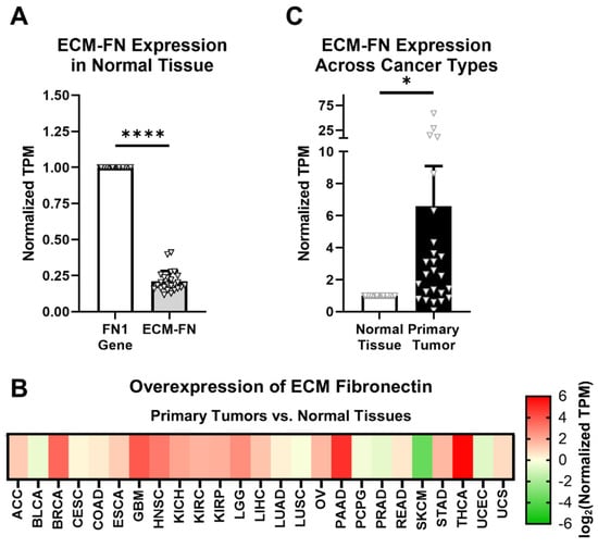 ECM-FN accounts for approximately 21% of total FN mRNA in normal tissues, representing a significantly small proportion of total FN mRNA expression (Figure 3A). In addition, ECM-FN follows similar overexpression patterns in primary tumors to the FN1 gene as a whole. Of the 25 cancer types analyzed, 19 (76%) overexpress ECM-FN in primary tumors compared to normal tissue (Figure 3B, Supplementary Table S5). Furthermore, primary tumors exhibit 6.60× overexpression of ECM-FN relative to normal tissue, which is substantially higher than the 5.23× overexpression of the FN1 gene (Figure 3C).