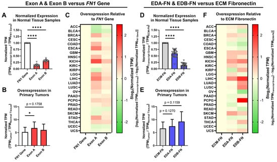 The expression of EDA and EDB in FN was next explored in normal tissue and primary tumors. When analyzing all available FN transcripts, both Exon A and Exon B represent significantly small proportions of the FN1 gene as a whole (Figure 4A). In primary tumors, whereas the FN1 gene exhibited an average overexpression of 5.23× compared to normal tissue, Exon A and Exon B both exhibited significantly higher overexpression at 6.77× and 6.03×, respectively (Figure 4B, Supplementary Table S4, Supplementary Figure S2). When looking at individual cancer types, Exon A exhibited higher normalized expression than the FN1 gene in 17 out of 25 (68%) cancer types, while Exon B exhibited higher normalized expression in 19 out of 25 (76%) cancer types (Figure 4C).