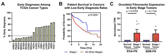 Oncofetal FN expression and early-stage diagnosis. (A) Percentage of patients diagnosed at stage I by cancer type. (B) Pan-cancer Kaplan–Meier survival curves of stage I patients (n = 363) compared to those diagnosed at all other stages (n = 2273) for cancer types with less than 20% of early-stage diagnosis. (C) Oncofetal FN expression in stage I tumors compared to corresponding normal tissue expression (n = 7). Cancer types were excluded from analysis if the number of normal tissue or stage I tumor samples was fewer than 10.