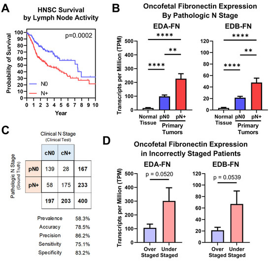 To further examine this, a binary classification test was performed. HNSC is the only cancer type in the TCGA database for which clinical and pathologic N stages are both supplied for a majority of samples in the dataset. In this test, pathologic N stage (pN), which is determined via lymph node dissection and subsequent histological examination, represents the ground truth, while clinical N stage (cN), which is determined via physical and radiological examination, is the clinical test. The binary classification included 400 HNSC patients, with a prevalence of positive lymph node activity of 58.3% (Figure 6C, Supplementary Figure S4). Clinical N staging correctly staged 139 patients as N0 and 175 patients as N+, yielding an accuracy of 78.5% (Figure 6C, Supplementary Figure S4). However, 58 patients who were clinically N0 were pathologically N+, representing understaged patients, while 28 patients who were clinically N+ were pathologically N0, representing overstaged patients (Figure 6C, Supplementary Figure S4). Looking strictly at patients who were incorrectly diagnosed, both EDA-FN and EDB-FN expression were borderline significantly higher in understaged patients compared to those that were overstaged (Figure 6D). This result is in agreement with the overall expression trends observed when analyzing all N0 and N+ patients shown in Figure 6B. With this in mind, targeting oncofetal FN presents on opportunity to enhance the diagnostic procedures for lymph node activity in head and neck squamous cell carcinoma and has the potential to be applied to other cancers with high rates of lymph node activity as well.