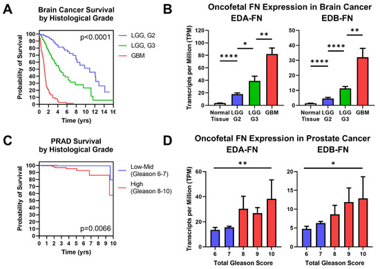 Oncofetal FN expression and histological grade. (A) Kaplan–Meier survival curves for brain cancers separated out by histological grade (LGG G2, n = 247; LGG G3, n = 260; GBM, n = 152). The colors of the curves correspond to the column graphs in (B). (B) Oncofetal fibronectin expression in brain cancers and corresponding normal tissue (n = 1152), separated out by histological grade (LGG G2, n = 247; LGG G3, n = 260; GBM, n = 152). Glioblastoma multiforme was considered the highest grade of brain cancer. (C) Kaplan–Meier survival curves for prostate cancer of low–mid grade (Gleason score 6–7; n = 271) and high grade (Gleason score 8–10; n = 191). Groups were combined for sample size purposes. The colors of the curves correspond to the column graphs in (D). (D) EDB-FN expression in prostate cancer separated out by total Gleason score (6, n = 43; 7, n = 228; 8, n = 57; 9, n = 131; 10, n = 4). Statistical analysis for prostate cancer data used the Kruskal–Wallis test. Significance: *, p < 0.05; **, p < 0.01; ****, p < 0.0001.