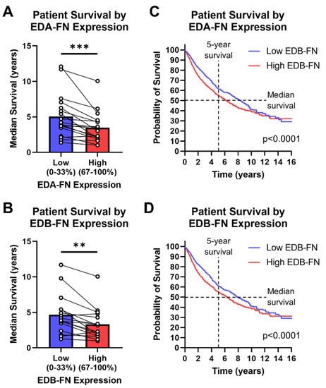 Aside from correlations between FN expression and clinical diagnostic information, FN expression has been shown to correlate directly with patient survival in several cancer types. The TCGA database provides survival information for most of the patients included in the study, so patients can be grouped based on high (top 33%) or low (bottom 33%) FN expression within each cancer type. In this analysis, there is a clear and significant trend of reduced median survival in patients expressing high EDA-FN and EDB-FN compared to those with low expression (Figure 8A,B). On average, patients expressing high levels of EDA-FN exhibited approximately 29% reduced median survival time compared to the low-expression group. Similarly, patients expressing high levels of EDB-FN exhibited approximately 26% reduced median survival time on average. Some of the largest reductions in median survival time are found in bladder cancer, esophageal cancer, mesothelioma, stomach adenocarcinoma, lung squamous cell carcinoma, and low-grade glioma (Supplementary Table S6).