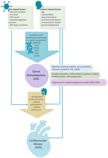 However, the causality of these associations should be established with prospective studies adequately controlled for all possible confounders and adequately powered to detect a relationship between HIV infection duration, ART duration, viral load, or inflammatory markers. When designing such studies in the future, it is important to consider ways to decrease biases and maintain the generalizability of the results with broad participant eligibility criteria. Furthermore, technical details such as the sequencing starting material (whole blood vs. peripheral blood mononuclear cells), the sequencing ‘modalities’ sensitivity to detect low VAF, the variety of screened mutations, and the VAF cut-offs with the exclusion of germline mutations should be predetermined after weighing sensitivity with clinical meaningfulness of the findings. A large prospective study with long-term follow-up would be ideal to identify which aspect(s) of HIV infection drives this relationship with CH and the time course of the mutational landscape. Finally, this would allow the investigation of a possible impact of CH in developing CVD in PLWH as a mediator or inducer of inflammatory changes in the monocytes in these individuals, causing high-risk atherosclerotic lesions.